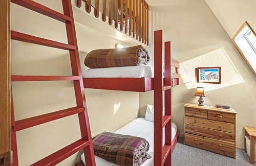 Experience mountain living in this charming character suite set across the top two floors of an A-frame peak. The queen master bedroom, nestled within the peak itself, offers a private ensuite. The second bedroom provides versatility with a bunk bed and a lofted double bed, while the third bedroom downstairs features a comfortable queen bed. The bright, open-concept living area offers breathtaking views, a fully equipped kitchen, and a cozy gas fireplace—perfect for gathering after a day on the slopes. Step out onto the private deck to relax in the hot tub, fire up the BBQ, or store your gear in the ski locker conveniently located at the base of the stairs. Accommodating up to 5 guests, this unique suite is ideal for a memorable mountain getaway. No dogs allowed. The hot tub is unavailable during the summer season.