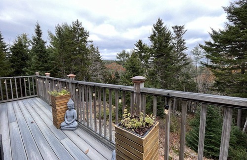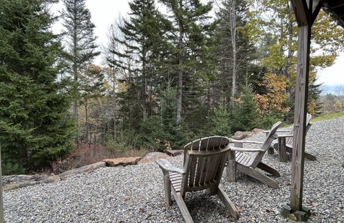 Unwind or grill on the back deck with private mountain valley views, and peeks and sounds of the rushing Ducktrap River below. Walk out from the lower level onto the natural crushed stone private patio overlooking protected forest land.