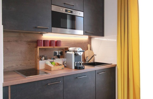 The cottage consists of a living space including a living room with TV lounge area and a table for 4 people as well as a small kitchen equipped with dishwasher, hob and combined microwave. All utensils and crockery are at your disposal.