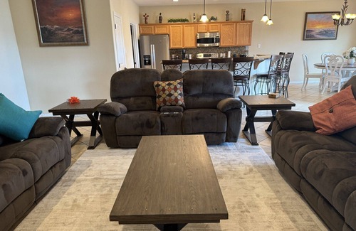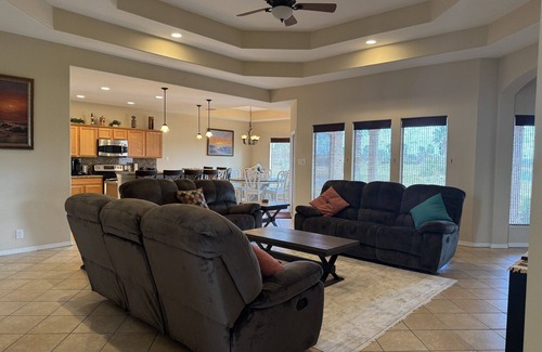A 3 bed 2 bath with 1 king bed and 2 queen beds. It's the epitome of resort-style living. This stunning property has lake views right from the front and back patios , not to mention sunsets in a gated community. . Located right on the golf course. 2 car garage plus golf cart space. Primary bathroom fully equipped with two separate vanity areas, huge walk-in closet. An entertainer's dream, outdoor amenities include community pool, tennis court, pickle ball court. Golf Pro Shop, exercise room and activity center.