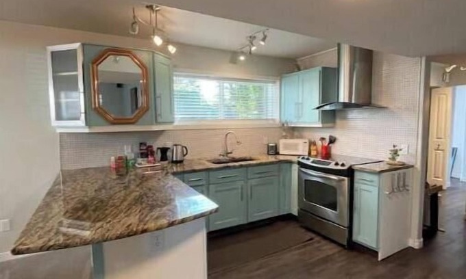 This fully self-contained suite offers everything you need for a relaxing stay in Vernon. Enjoy a cozy atmosphere, private patio, and fully equipped kitchen. Unwind in the living area with a sofa that converts to a bed, or watch Netflix in both the living room and bedroom. The suite includes your own laundry, driveway parking and private entrance. Located a short distance from the town center, you’ll have easy access to local shops, dining, and attractions.