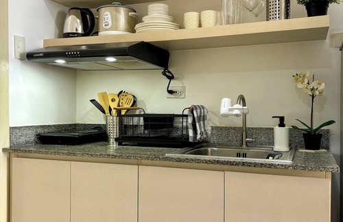 Complete appliances (microwave, induction cooker and cooking utensils, rice cooker, electric kettle, ref, dining utensils incl wine glasses for those romantic or chill nights)