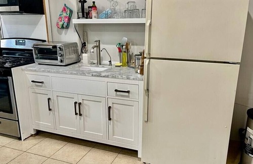 This is a great place to stay for its central location and various amenities! You have your own private entrance and exit on the property as well as in unit washer and dryer. The space includes a large bathroom with a double vanity and a full kitchen with oven and large fridge!