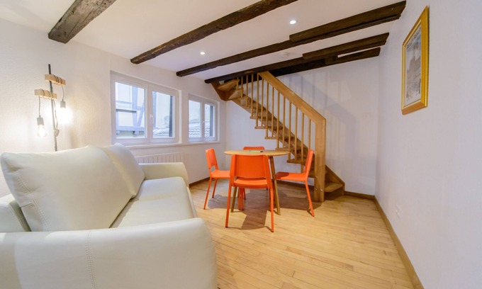 A charming flat on two floors (living room with an open kitchen and the convertible sofa on the ground floor and upstairs bedroom). It is very cozy and quiet, in the historical center and the pedestrian zone of Strasbourg next to St. Thomas church.