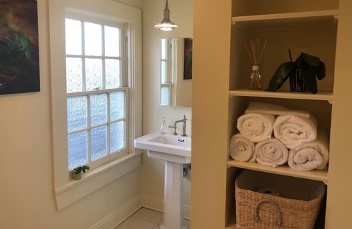 Our backyard is fully fenced and offers a respite from the city. You are welcome to relax in the chairs and swing in the hammock. Please don't pick the vegetables or flowers, but please do enjoy them and smell the roses!
