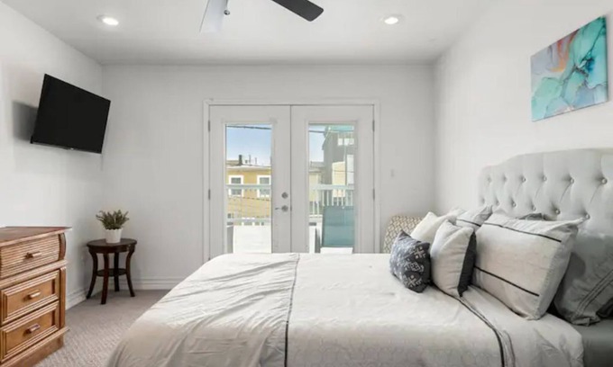 Keyless entry. Main floor has living room, eat-in kitchen, dining area and half bathroom. Second floor has two bedrooms. Master bedroom features its own private bathroom and king size bed. Second bedroom has queen size bed, hall bathroom, and private deck with seating. Both rooms have large closets with hanging bars and shelves. Comfy beds and blackout curtains for a relaxing sleep. Dedicated workspace with printer, fully equipped laundry room, iron with ironing board on second level. The basement is not accessible to guests. Property is monitored by cameras posted outside the front and back doors.