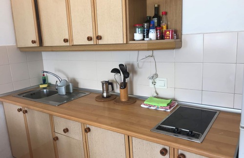The kitchen is equipped with a stovetop and a refrigerator, as well as a coffee maker, an electric kettle, and a microwave. Bathroom amenities include a hair dryer, a bidet, and towels. And there is a laundromat nearby so you can pack a bit lighter. Other amenities include bed sheets, an ironing board, and a dining table.