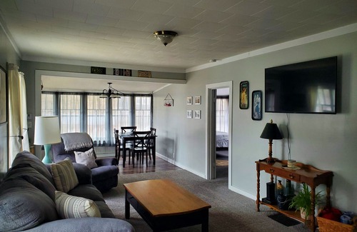 This cozy cottage features two bedrooms, one with a queen bed (bedroom one) and the other with two full beds (bedroom two). Bedroom one includes a closet, dresser and full length mirror. Bedroom two has a closet, dresser, full length mirror, small fan and a smart Roku TV. The open floor plan offers seating for your family with relaxing lake views. Walk out the front door and be just steps away from Greenville’s beautiful Baldwin Lake. The living room seating includes a 3-piece sofa, and one extra-large recliner chair. The dining table can comfortably seat four diners, for further seating there are two bar stools by the open breakfast nook between the kitchen and living area. The kitchen is fully equipped and furnished with a range of facilities including stove, coffee maker, refrigerator, freezer, microwave, toaster, etc.
