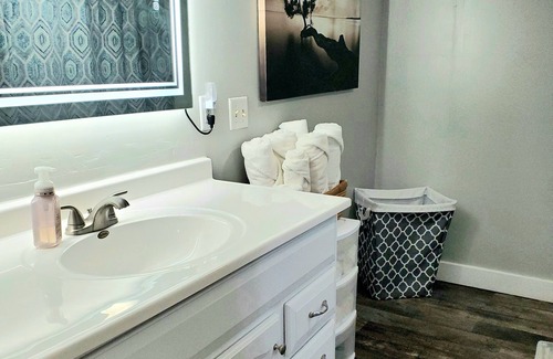 The bathroom is fully functional with a tub/shower, large vanity, large well-lit mirror and fresh towels for your stay. Please do not flush anything other than toilet paper, we operate on a grinder pump and other products very likely could cause damage. No feminine products or wipes!