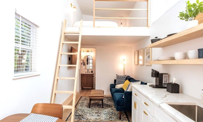 The Space: The tiny home is a charming and well-appointed tiny home nestled in the backyard of the main house on property, offering both privacy and accessibility to all of East Austin's hot spots! With 13' ceilings, it's filled with natural light and a layout designed to make the most your tiny home experience. Enjoy the benefits of a cozy, yet surprisingly spacious environment. You'll also have access to a quaint outdoor deck—perfect for savoring your morning coffee or relaxing with an evening nightcap.