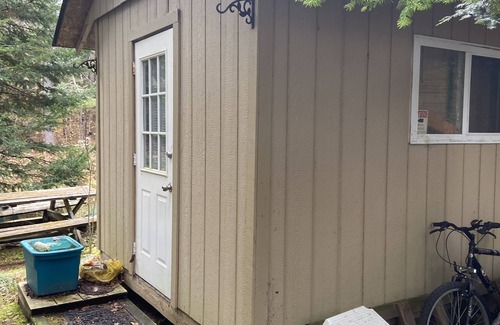 The bunkie itself does not have electricity or running water and is a 10x10 single room with a futon sofa for sleeping. We provide batteries to charge usb devices as well as utensils/cutlery for dining and handwashing/dish water. The nearby bathroom features a composting toilet. Drinking water is not provided. Breakfast is not included. BYOPropane for the small grill.