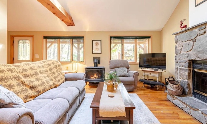 Come stay at our cozy, all-season Poconos mountain cabin! BBQ with the family on the back deck, make s'mores by the fire pit, sip tea on the front porch or read a book on the unique loft space. Only 5 min from Ski Big Bear for snow tubing, cross country ski, and more. In summer tan on the beach at the lake, kayak, ski or motor boat. Enjoy a cocktail by the outdoor pools near the tiki bar while kids play mini golf. You can also, hike, tennis, bike, workout at gym, horse ride or visit petting zoo!