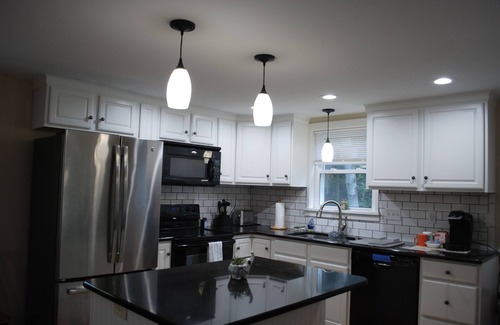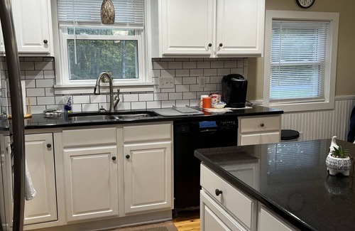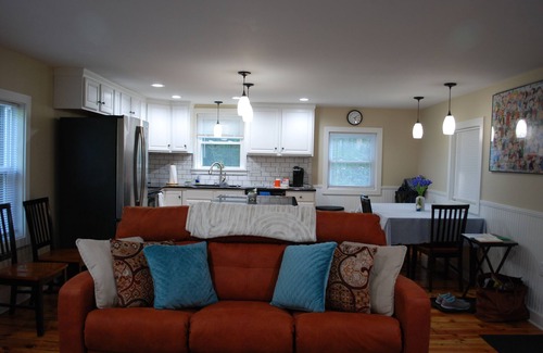 Air conditioned first floor features living room with reclining sofa and two swivel barrel chairs, along with large coffee table and console. Kitchen includes full sized French door refrigerator with bottom freezer, electric convection oven, coffeemaker, toaster, and microwave. Basic cooking tools available including pots and pans, dishware, flatware, and drinking glasses. Small central island offers seating for two with room for food prep. Full sized dining table seats up to six. Wifi available for personal use.