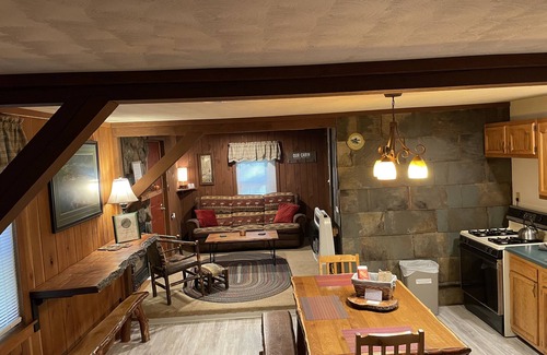 Our cabin is privately nestled among the hemlocks with a spacious yard and amazing outdoor fire pit. The cabin is two stories with a well stocked eat in kitchen, living room, private bedroom, and full bath on the first floor. The second floor has a queen bed and two full size beds as well as a couch and seating area with flat screen TV and DVD player to get away. Cabin sleeps a maximum of 6.