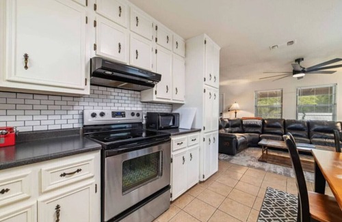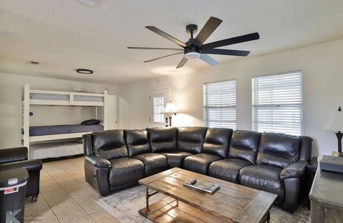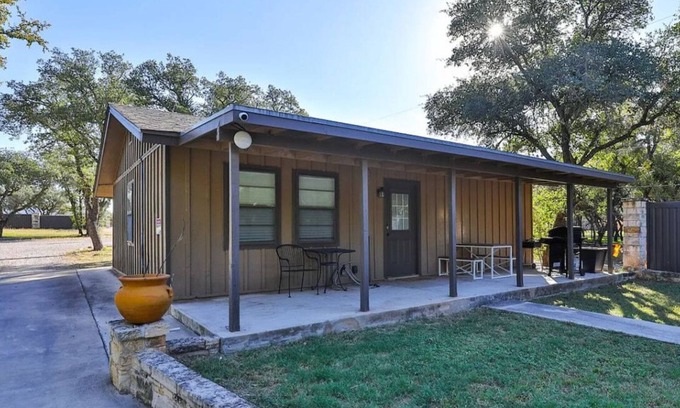 This snug little cabin sits within walking distance from the 2-story dock leading into Lake Brownwood. Includes one private bedroom with a queen sized bed and three bunk-style twins. If you include the large sectional couch, there is plenty of room to sleep more! With an open layout, you'll easily be able to access the kitchen and laundry amenities.