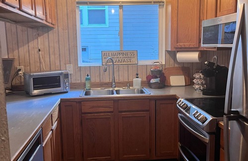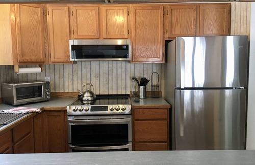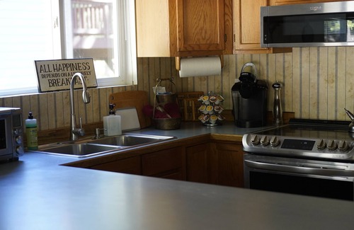 The home is equipped with everything you need for a relaxing stay, including unlimited wireless internet access, wood stove with firewood and fire starters provided, a gas grill, ice maker, washer and dryer, & wall heaters in each room. Prepare your favorite meals in the kitchen, fully stocked with plenty of cookware, stemware and newly installed stainless steel appliances which include double ovens.