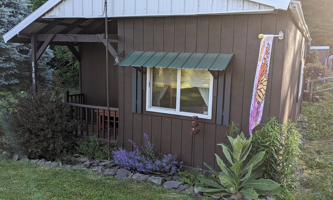 Glamping at its best here! Take full advantage of our 450 square foot cabin. Completely furnished and functional with a full kitchen, half bathroom, outside shower, living room area and sleeping quarters. Or bring your camper/RV and also enjoy the use of our cabin. Additional fee applies. Outside you'll find yourself surrounded by a charming landscape and a trickling creek throughout the one acre property.