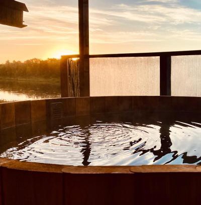 Food & DrinkTea/Coffee makerBathroomShampoo, Private bathroom, Towels, Body soap, Shower, Hairdryer, Bathtub, Free toiletries, Toilet, Toilet paperMedia & TechnologyTV, Flat-screen TV, Streaming service (like Netflix)GeneralAir conditioning, Smoke Alarm, Carbon monoxide detector, Heating, Fire extinguisher, Hardwood or parquet floors, Trash cans, Iron, Private entranceActivitiesHot tubOutdoorsPatio, Outdoor furniture, BalconyKitchenMicrowave, Oven, Refrigerator, Toaster, Kitchen, Stovetop, Wine glasses, Cleaning productsLiving AreaFireplace, Desk, Sofa, Sitting area, Dining areaViewView, River view, Lake viewBedroomLinens, Childrens' cribsBuilding CharacteristicsDetachedEntertainment & Family ServicesBoard games/puzzlesRoom AmenitiesNon-feather pillow, Socket near the bed |