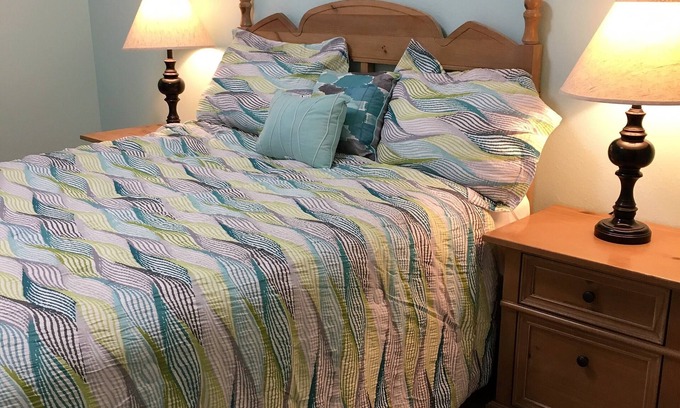 It has 2 bedrooms with queen size beds, closet, dresser and end tables. There is a small work desk available in one bedroom.