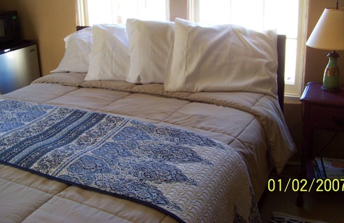 A small suite located at the rear of the ranch house. This is a small space but very private and comfy. The room has a queen bed, small bathroom with single shower. We have included a comfy swivel rocker and a small table and chairs that seats two for coffee or dining. For your convenience we have also included a mini fridge, microwave and coffee maker (includes coffee, filters, cream/sugar) tea bags, and coffee cups, also wine glasses (just in case). This area has a private patio with seating for two, great place to enjoy the beautiful sunsets, wildlife and perhaps a glass of wine.