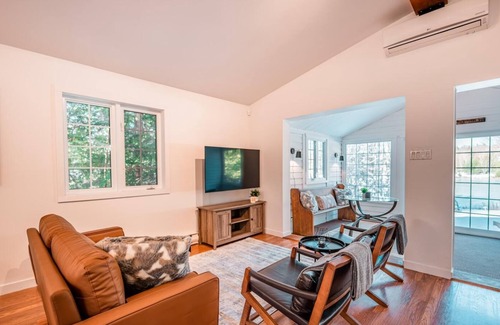 This cozy property is located directly on a small Lake. after coming out of the house and walking passed your private hot tub through the grassy backyard you reach the doc located on the quiet non motorized lake.
