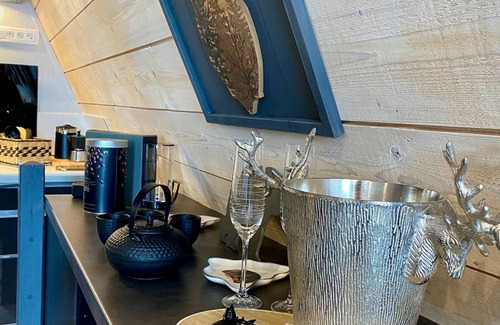 On the ground floor, you will find an entrance with a cupboard, followed by a living space with an open kitchen. From there, you will enjoy a breathtaking view of the lake and the mountains. The bio-ethanol fireplace creates a unique atmosphere. The kitchen is perfectly equipped with an oven, microwave, dishwasher, refrigerator and various utensils, including a Nespresso coffee maker, a raclette machine, a fondue set, a crepe maker, etc. The large television has a TV box and Wi-Fi access is available throughout the chalet.