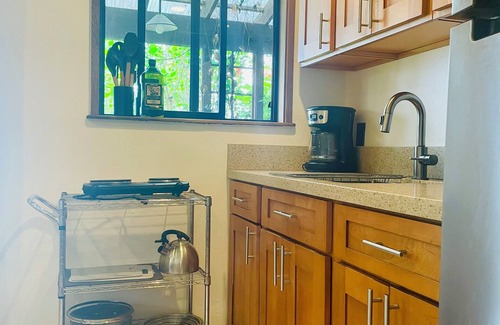 The Ohana has one bedroom, 1 full bathroom, a kitchenette with full-sized fridge/freezer, 2 burner electric hot plate, toaster oven, and microwave, and living room with a fold down futon couch. We have a pack-n-play available upon request. Dining is alfresco on your own covered lanai with ocean view. There are a mini washer and dryer out on the lanai. There is also a gas grill on the lanai. The gated property is on four acres with beautiful trees and plants. It is in a cloud forest so most afternoons we get some rain. We have goats, cats, a small dog, chickens, and ducks on the property as well as beautiful native pheasants, parrots and wild birds.