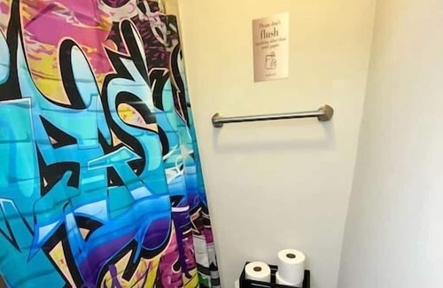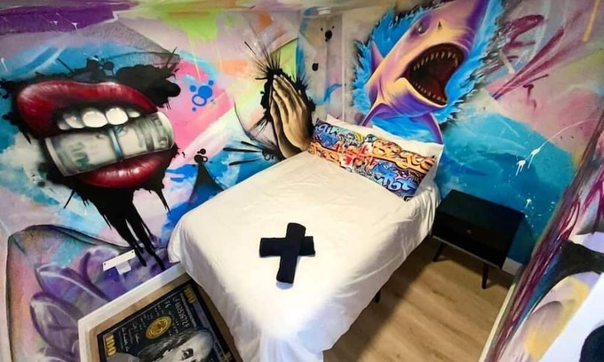 As you step into our cozy space, you'll find a room enveloped in one-of-a-kind murals and captivating art that adorns every wall. It's not just accommodation; it's an art experience!