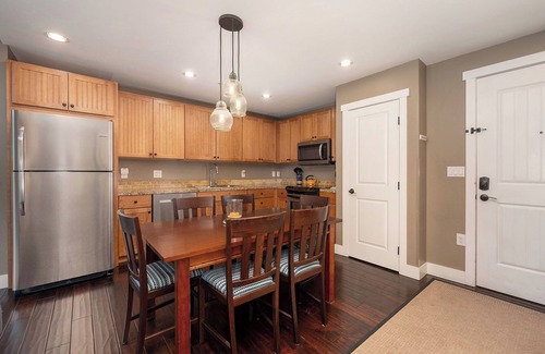 Step inside to a warm and welcoming space, complete vaulted ceilings, a gas fireplace, cozy seating, and slope-facing balcony views. The open-concept layout includes a fully equipped kitchen and dining area, ideal for sharing meals after a day on the trails or the slopes. The condo’s thoughtful touches—like board games, cozy bedding, and coffee options—help make your stay feel like home.