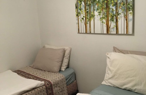 With a tall ceiling, large open plan living room with leather sofa and chair and a large flat tv, you can enjoy free WiFi and Netflix. Two new soft twin beds in each room and a newly remodeled bathroom, all linens are provided. The kitchen is fully equipped with dishwasher, toaster, coffee maker, coffee and cream, dishes, glassware, silverware baking and cookware, and basic spices, oil,salt and sugar are available, along with paper towels, and napkins,