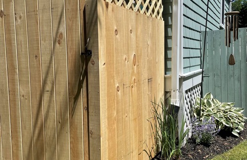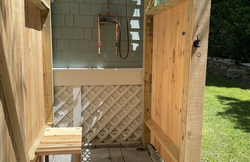 One bathroom with a stall shower. & Seasonal OUTDOOR SHOWER . Very private! Listen to the birds serenade you while you refresh.