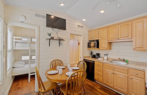 Our Whiteface model vacation cottages are 400 square feet and have 2 bedrooms, a kitchenette with a dining area, 1 bath, and a double pullout couch in the living area. Other modern conveniences include central air/heat, flatscreen TVs, cable, and Wi-Fi.