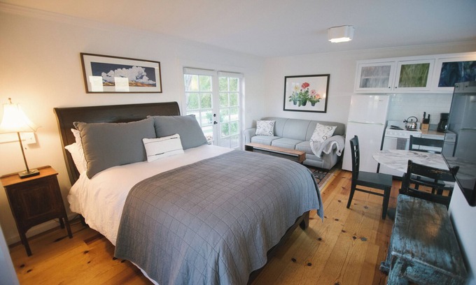 The Cozy Cottage has a private entrance, private deck with outdoor dining and fire pit with sweeping views of Edna Valley. The studio features a queen bed and a sofa sleeper accommodating up to 4 guests. The kitchen is equipped with a small refrigerator, stove, oven, and sink. There is also private bathroom within the studio. We welcome dogs to stay and there is a fenced yard.