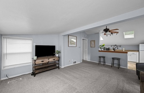 Step inside to discover a haven of comfort and style. This charming garden house converted bungalow boasts shorter ceilings, creating an intimate atmosphere that welcomes you in. The home requires a short staircase to go to the main level. Our bungalow also has an open layout with the living room and kitchen area connected. Next to a private bedroom and bathroom with shower and tub.