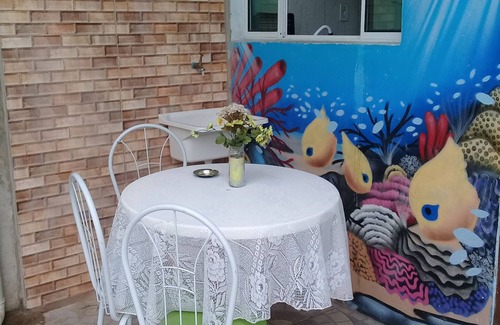 Living room and kitchen with double sofa bed, TV. LED 32 "Full HD, countertop with stools, fridge, stove, cabinets, sink with cabinet, household items (plates, glasses, cutlery, pans, pressure cookers, etc ...), microwave and blender , a bedroom with 01 double bed and double sofa bed (support), young man and closet with hangers, a bedroom with 02 bunk beds and wire, both bedrooms with shelves, ceiling fan, pillows and bedding (sheets, overlens and pillowcases, without exchange), a bathroom, 02 parking spaces, barbecue, tank, clothesline and table with chairs, plus a games room, bar, social bathroom, shower and internet via Wi-Fi.