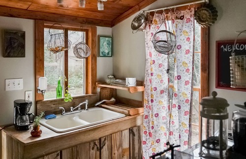 The cozy and magical Yerba cottage sits nestled on the historic grounds of the Yerba at Bastrop property, where the main house is listed in the National Register of Historic Places. The cottage itself is an historic structure that offers a combined and cozy living/sleeping area with one comfortable double and one comfortable single bed. The separate kitchen opens to the backyard and chicken coop and boasts a full-size oven and refrigerator as well as the needed kitchen and cookware to make your visit comfortable and easy. The bathroom, while also cozy, has a rejuvenating deep climb- in bathtub/combo. Sit on the front porch or back steps to feel the breeze, enjoy your coffee and watch the birds.