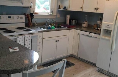 This charming home includes an open floor plan with nicely appointed seaside decor. Two bedrooms (one queen bed, one double bed), plus a sunroom with a twin day bed and a queen size pullout sofa in the living room, one full bath, and an outdoor shower (yes, hot & cold!).. Amenities include AC window units, washer, dryer, dishwasher , flat screen TV's, cable/internet, fully equipped kitchen and lots more.