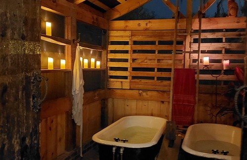 The outside wet room has a huge rainfall shower head and two clawfoot tubs side by side. adjacent to that is an outhouse with sink and toilet. Also, outside is a large, covered deck with table and chairs, sofa and other furniture. Also, there is a huge water feature with fireplace, outside kitchen with sink, grill and ice maker.