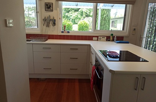 The kitchen has electric 4 burner stove top, oven and fridge. Tea, coffee, salt, pepper, oil are also provided. Dining can be either at the kitchen bench or at the dining table looking out into the garden, or wherever you please. Out from the kitchen is another comfortable lounging space perfect to put your feet up and get into a good novel.