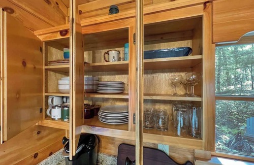 Tucked Inn is off the main road “tucked” away from traffic noise so it is quiet and peaceful. It has been professionally decorated and newly furnished to make your stay comfortable. There is cable TV provided in the main and second room and access to streaming on all TVs. You will find an assortment of games for you to enjoy. Your view off the front porch is peaceful and secluded year round. The hot tub is brand new and positioned for you to enjoy the view from both sides of the cabin. There is a fire pit just off the deck for convenient enjoyment and easy access (firewood not provided). Everything at Tucked Inn is all on one level (no stairs inside the cabin) and at your fingertips so all you have to do is relax and enjoy.