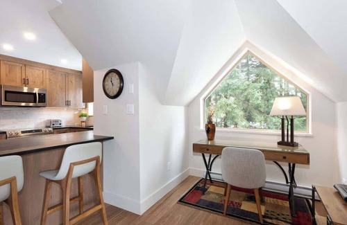 This multi-level retreat combines comfort and calm in a forested setting near Blackcomb Mountain. The open-concept living area features hardwood floors, vaulted ceilings, and a large sectional sofa gathered around a presto log fireplace and wall-mounted TV. Sliding doors open to a covered balcony with outdoor seating, where you can relax beneath the trees. A dedicated workspace beside the living room offers a quiet spot for planning the next day’s adventures or catching up on work.