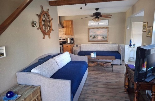 There is a large grassy tree lined front yard with plenty of parking for guests and toys. The Shady Rest downstairs has dining area, kitchen, full bathroom with combination bathtub and shower. The living room has a double French door to the patio. Sofa day-beds are two twin beds one with storage and one a twin trundle bed. Upstairs has area with a twin bunk bed and closet on one side and a queen bed on the other.