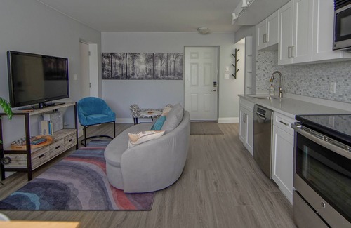 Escape to our bright, newly renovated 1BR garden suite in North Vancouver! Enjoy a fully equipped kitchen with luxury appliances, a garden deck, free parking, and easy self-check-in. Located at the heart of BC's best hiking and downhill mountain biking trails. Close to Shipyards, Grouse Mountain, and Stanley Park. Public transit, Evo car-share, and Lime bikes make exploring easy. Walk to shops, restaurants, theatre, pharmacy, liquor store & more. Perfect base for adventurers and relaxers alike!