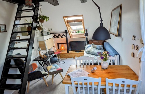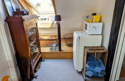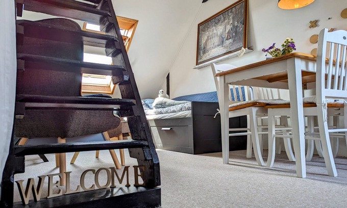 The space in our compact cozy areas is divided into a room with a door, an open room with adjoining kitchenette (no cooking possible), a loft and a bathroom.
