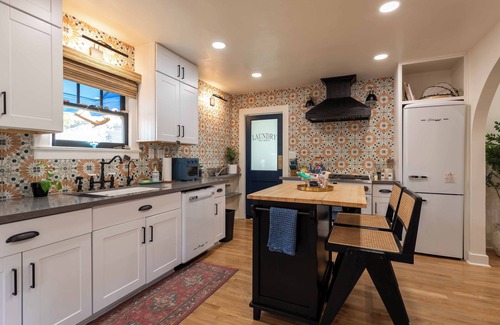 This property features two bedrooms with one queen bed and two twin beds, the children are welcome with a crib and baby items available upon request. The kitchen is fully equipped with nontoxic Caraway pans and Smeg appliances, and the living room features a gas fireplace. Guests can also enjoy a movie room with an oversized daybed, and the backyard offers a built-in grill and gas fireplace with seating, perfect for outdoor meals and drinks under the beautiful bistro lighting.