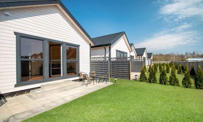 Professional and attractively equipped holiday resort 650 meters from the beach, on the outskirts of a quiet seaside settlement (Łazy), in the immediate vicinity of Lake Jamno. Comfortable, single-storey holiday homes. Each with a terrace (garden furniture set) and a small, private garden. The cottage has a living room with a double sofa bed and TV, a 3-person bedroom, a kitchen and a bathroom with a shower. Electric heating. Wireless internet is available. On the fenced area of the resort there is an attractive playground for children, a secure car park, a table tennis table. Barbecue equipment is available on site (there is a barbecue gazebo, a place for a bonfire). In the resort you can use the washing machine (for a fee). You can come to the resort (for a fee) with a dog, but only so-called gentle breeds are allowed. The price of your stay includes: bed linen, internet, final cleaning, a high chair and a baby bath (on request). In the immediate vicinity you can find many recreational facilities, restaurants and cafes. The international R-10 cycling trail runs nearby, which makes it easy and convenient to get to other nearby seaside towns by bike. The resort is located in the immediate vicinity of Lake Jamno, but convenient access to the water is approx. 600 m away. In the neighbouring Mielno you can rent water equipment (water bikes, kayaks, rowing and sailing boats) allowing for in-depth exploration of this body of water. There are also fishing spots here.