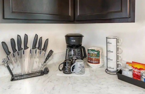Fully stocked with lots of appliances, coffee maker, utensils, cutlery, pots and pans, dinnerware, glasses, bowls, cutting board, toaster and lots more.