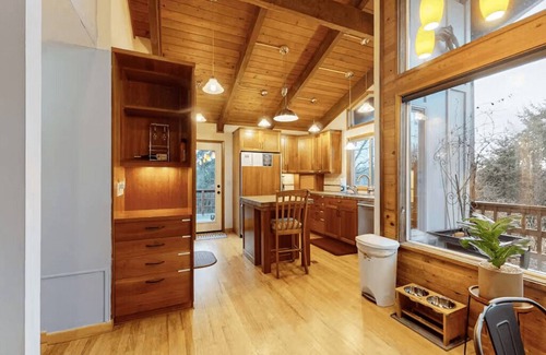 Step inside to discover beautifully designed wood-paneled living spaces flooded with natural light. Relax on plush furniture in expansive rooms, cook effortlessly in a stylish full kitchen equipped with high-end appliances, or host a laid-back barbecue on the deck with local brews and yard games—all while taking in stunning bay views. For remote work, two dedicated work-from-home spaces with high-speed internet ensure productivity without sacrificing comfort.