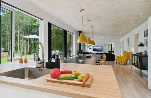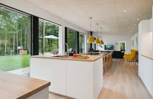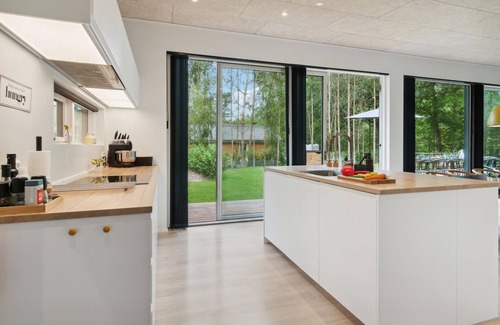 Welcome to this comfortable holiday home on a large natural plot in the middle of the wooded holiday home area in Fuglslev. Here you will find a fashionable, stylish building with a continuous red thread of straight lines and calm harmony, which is repeated in the interior. The living room quickly becomes the centre of communal activities, make yourself comfortable by the wood-burning stove, here the forest is almost in the backyard and nature becomes part of the holiday, whether outdoors or through the large panoramic windows that manage to bring nature right into the living room. Together with your extended family or guests, you can enjoy the ample space.