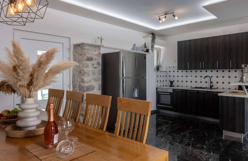 This villa is a combination of contemporary and rustic construction, built in 2022, and offers its guests 350 m2 of living space. It is fully air-conditioned and offers accommodation for a maximum of 10, and optimally 8 people. You will be comfortably accommodated in 5 bedrooms (200x165), three of which are located on the upper floor, and a cot is provided for the children, which is also available! The villa also has 6 bathrooms with showers and 2 additional toilets. On the upper floor there is also a living room with a three-seater, two armchairs, two stools, two coffee tables and a TV. Next to the living room is a dining room with a dining table and a kitchen that is equipped with everything you need to prepare meals for family or friends.